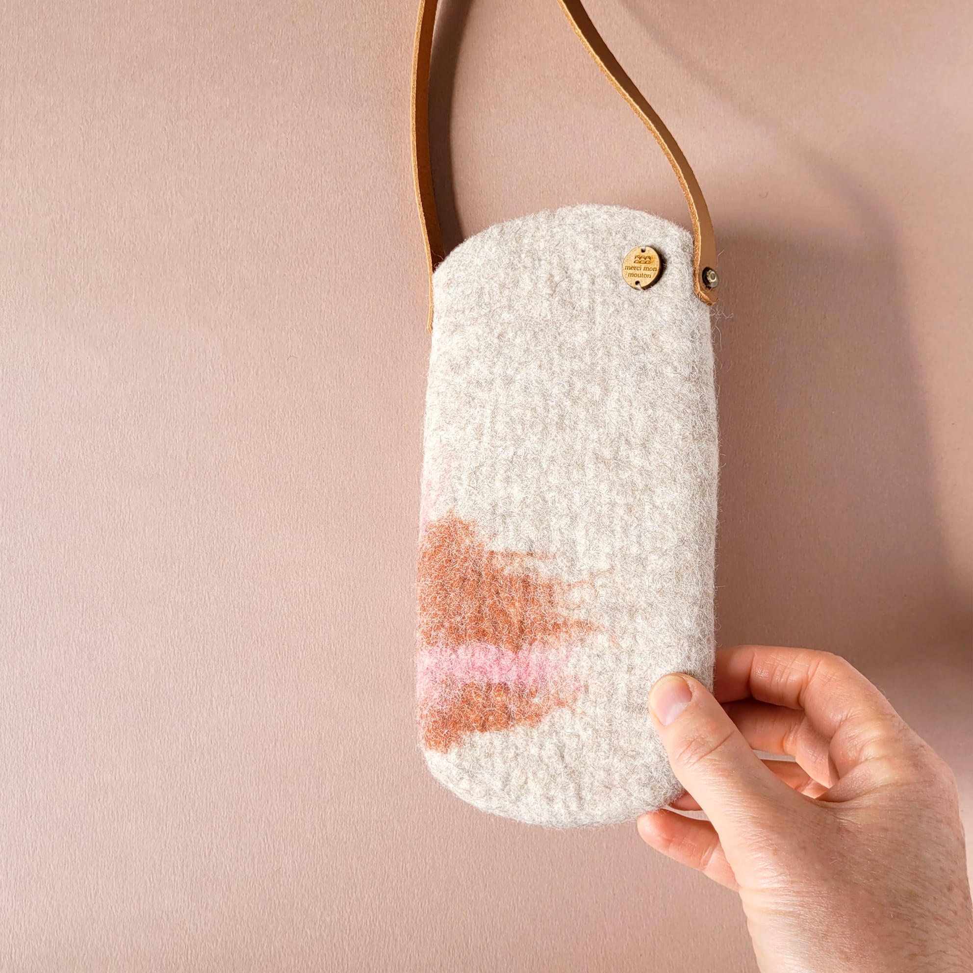 Mona est une pochette pour téléphone. Avec son feutre est épais et sa lanière en cuir, elle est à la fois solide, élégante et pratique.